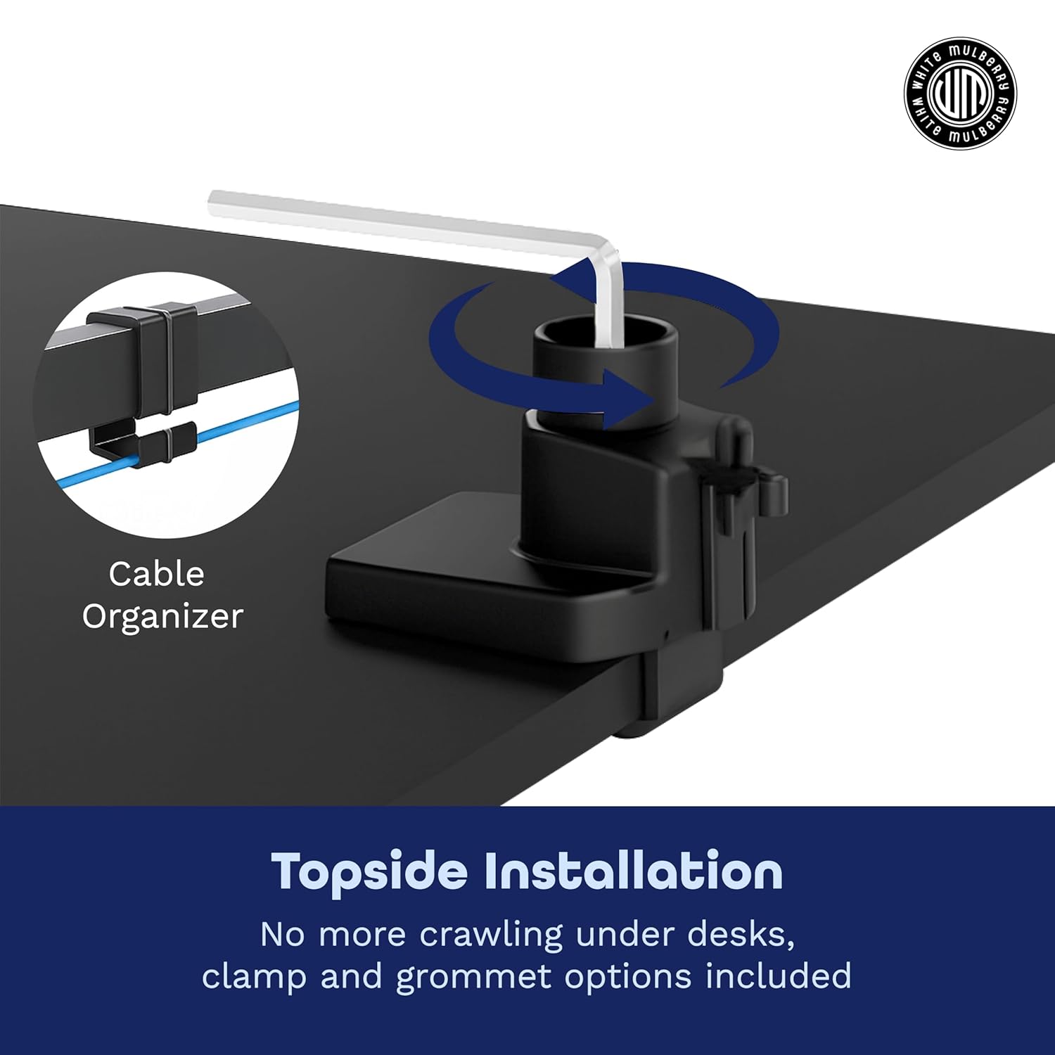 - Topside Installation – Easy setup from above the desk surface; smooth arm insertion ensures secure placement and perfect alignment of the spring-assisted arm.